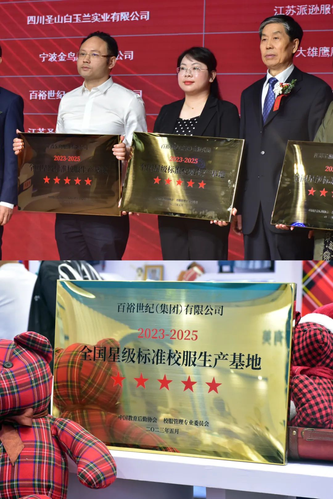 開(kāi)幕式上,中國(guó)教育后勤協(xié)會(huì)、校服管理專業(yè)委員會(huì)針對(duì)全國(guó)校服行業(yè)嚴(yán)格評(píng)選,對(duì)企業(yè)進(jìn)行全方位考評(píng),評(píng)選出“百裕集團(tuán)”等一批品牌形象突出、服務(wù)平臺(tái)完善、質(zhì)量水平一流的企業(yè),授予首批“全國(guó)星級(jí)標(biāo)準(zhǔn)校服生產(chǎn)基地”五星企業(yè)授牌,此次再獲主管部門(mén)頒發(fā)的又一榮譽(yù),是對(duì)百裕集團(tuán)的再次肯定,品牌價(jià)值再度升級(jí)。