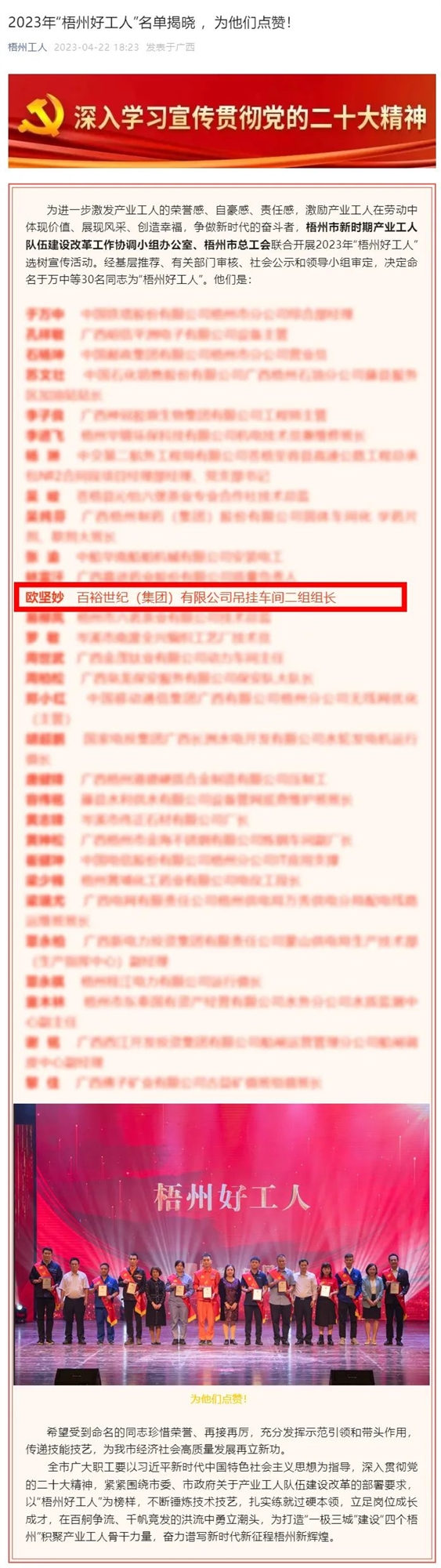 為進一步激發(fā)產業(yè)工人的榮譽感、自豪感、責任感,激勵產業(yè)工人在勞動中體現(xiàn)價值、展現(xiàn)風采、創(chuàng)造幸福,爭做新時代的奮斗者,梧州市新時期產業(yè)工人隊伍建設改革工作協(xié)調小組辦公室、梧州市總工會聯(lián)合開展2023年“梧州好工人”選樹宣傳活動。經(jīng)基層推薦、有關部門審核、社會公示和領導小組審定,最終選樹了30名“梧州好工人”。其中,百裕世紀(集團)有限公司吊掛車間二組組長歐堅妙榜上有名。