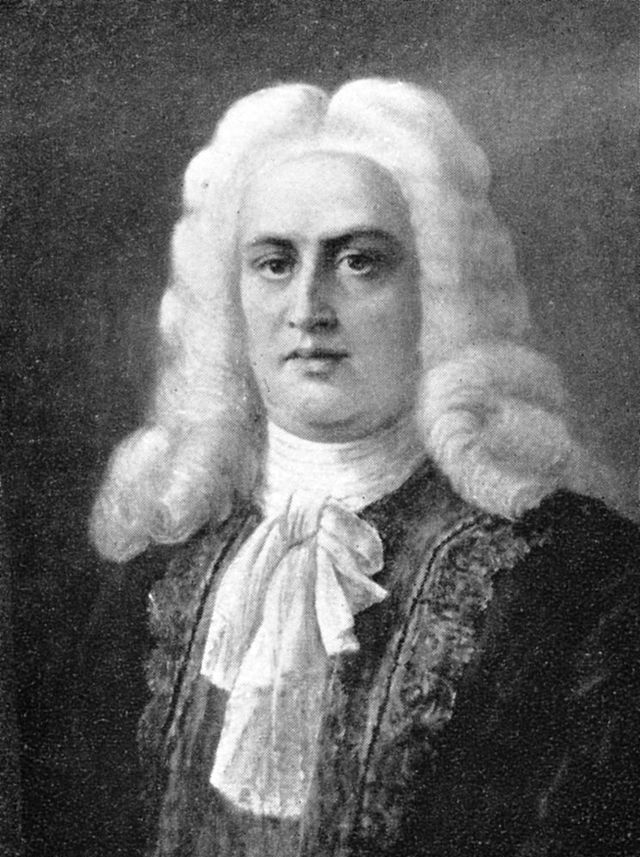 插畫,德國作曲家喬治·弗里德里希·亨德爾(1685-1759)。這個時期領(lǐng)帶的樣式在法朗士小說《領(lǐng)帶》中可見 :" 他的暗綠色上裝的領(lǐng)子豎得很高,他穿著一件南京紫花布背心,黑綢子寬領(lǐng)帶在他的頸子上繞了三圈。"