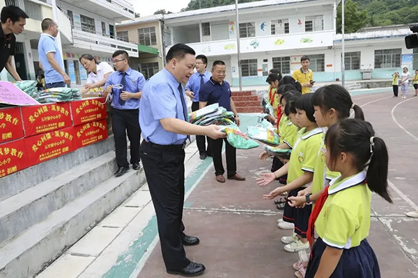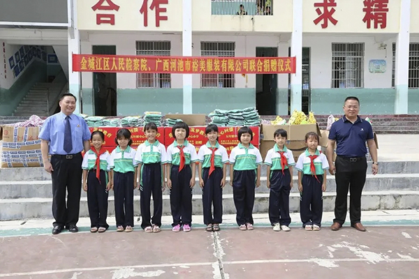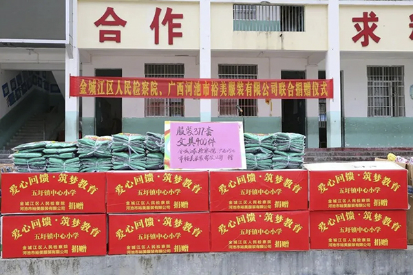此次活動,金城江區(qū)人民檢察院為五圩鎮(zhèn)中心小學捐贈共計價值8000余元的400套學生文具,百裕集團為五圩鎮(zhèn)中心小學捐贈共計377套價值33930元學生校服。